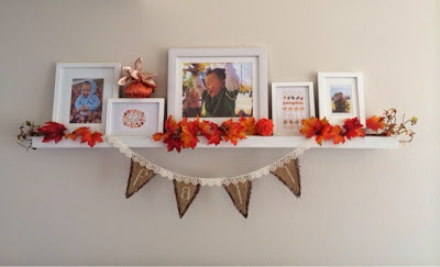 Last fall, my friend Cami and I got together and we both made a fall banner, or at least started one. Cami and her son are actually in the middle picture on the mantel, behind my little guy! We raked leaves on the lawn by her home that day and our boys had a lot of fun. :) Cami is so much fun to craft with! That's actually the reason we first hung out a few years ago, was to try a craft project together, and we have done a lot of crafts together since then! I was at her house one day when she suggested we make these banners. She already had most of the supplies, so we went for it! We cut out the burlap triangles and sewed the smaller ones onto the bigger ones, and then stamped the letters on with some stencils and ink she had. Finally, last month, I attached the triangels to this pretty ribbon. I LOVE it!